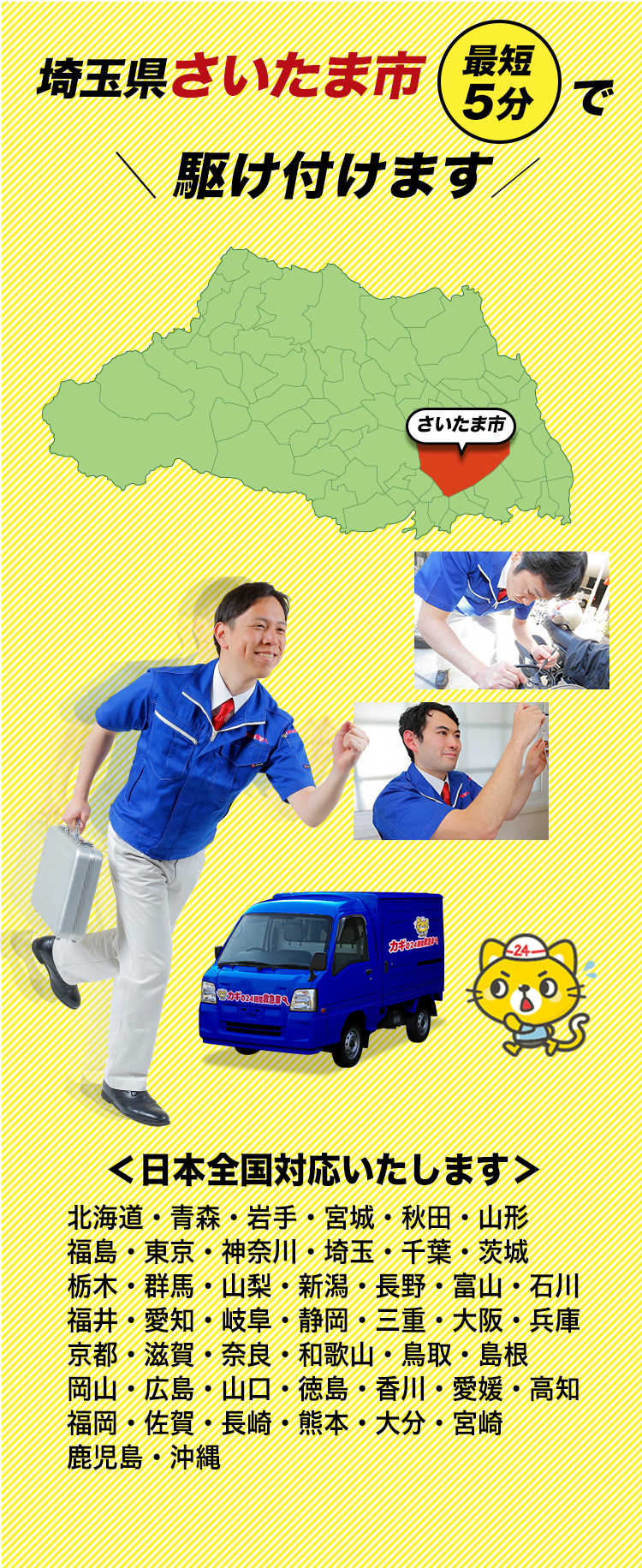 さいたまの「カギの出張24時間」は、大宮公園や浦和レッズホームタウンでの鍵トラブルに即時対応。さいたま市内全域をカバーし、お客様に安心をもたらすプロフェッショナルなサービスを提供。鍵の問題は私たちにお任せください。